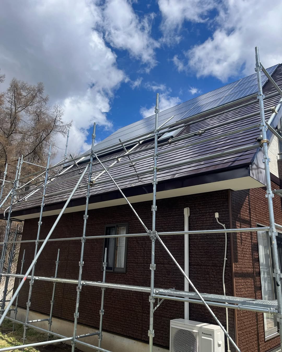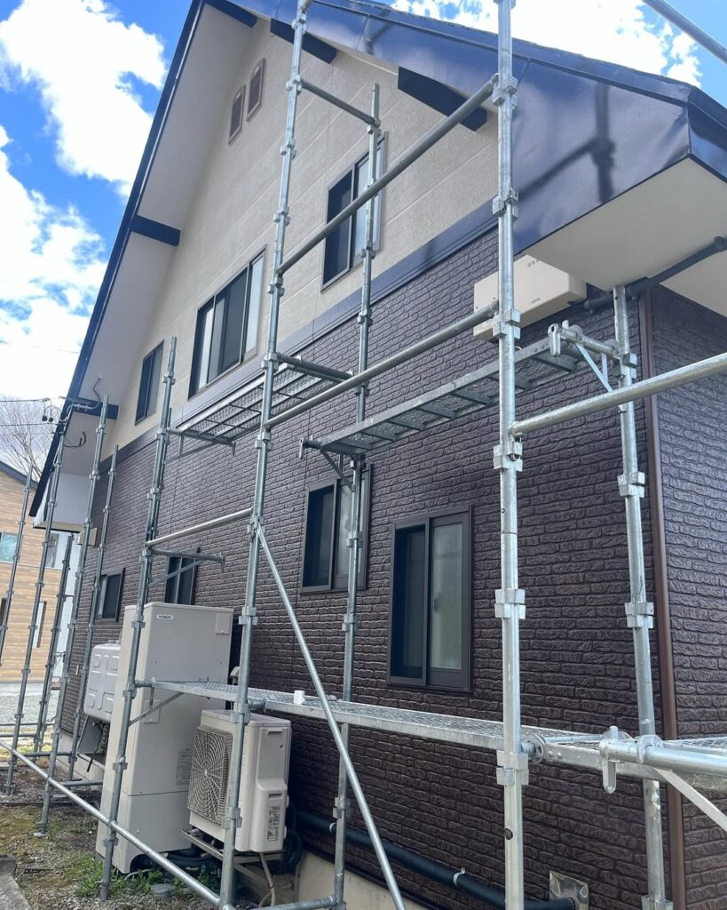 こちらのおうちは屋根の傾斜がきつい「急勾配屋根」でしたので、屋根足場も設置して施工させていただきました。